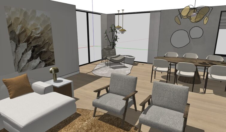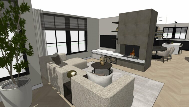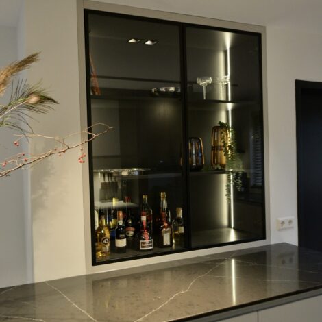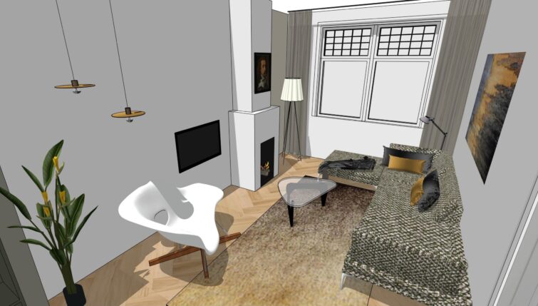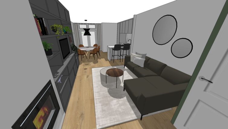 De opdrachtgever wilde graag een vernieuwde zithoek en een ontwerp voor de muur naast de keuken. De wens was om het appartement een luxe uitstraling te geven met kwalitatief hoogstaande producten en eyecatchers.