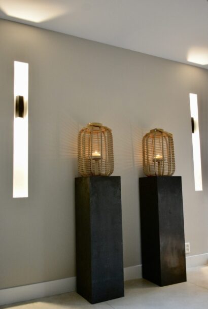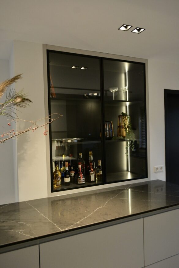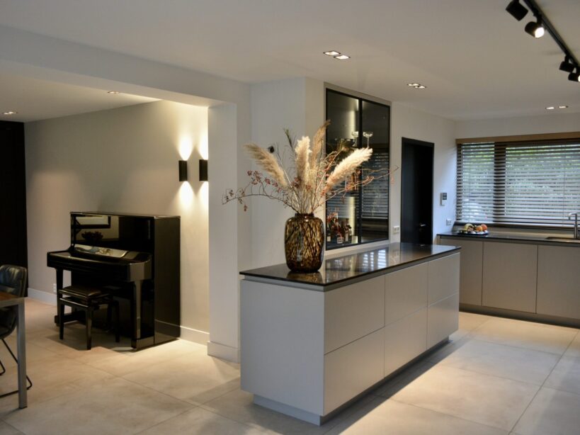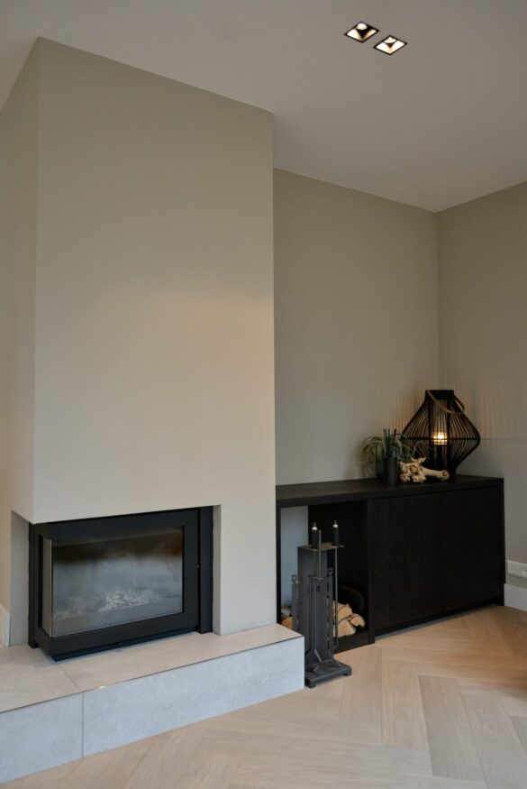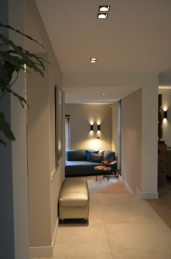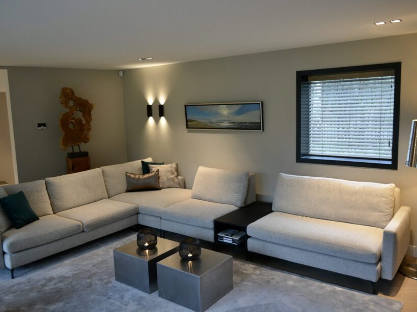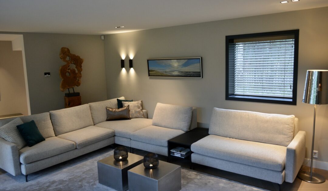 Millo interiors was verantwoordelijk voor het gehele ontwerp. Dit project begon met een 3D ontwerp. Zowel het indelingsplan van de meubels, de verlichting en de keuken werden uitgetekend. Millo Interiors verzorgde de persoonlijke begeleiding en had een adviserende rol bij het maatwerkbedrijf, de badkamer- en vloerenspecialist. De keuken is volledig volgens de ontworpen 3D tekening ontwikkeld. De opdrachtgever heeft een aantal meubels meegenomen die zijn opgenomen in het ontwerp. Al deze spullen moesten en eigen plekje krijgen waar zij goed tot hun recht zouden komen. Het complete verlichtingsplan pakte zeer goed uit. Veel plafonds en wanden moesten afgewerkt worden, waardoor verlichting kon worden ingebouwd. Er is gekozen om het overgrote deel van de wanden op de benedenverdieping in een tint te schilderen. Deze keuze geeft warmte en sfeer in de grote ruimtes. De custommade bank biedt genoeg plek om met de hele familie te kunnen ontspannen. Millo Interiors koos voor twee verschillende soorten vloeren, een tegelvariant en een houtparket. Deze combinatie biedt comfort, maar zorgt ook voor sfeer en afwisseling.